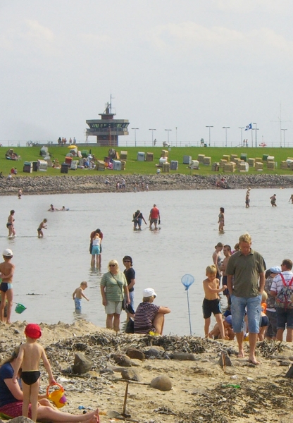 In Richtung Nord-Westen liegt die neue "Familienlagune Perlebucht". Dies ist der ehemalige "Sandstrand" Büsums, der im Frühjahr 2013 nach einjähriger Umgestaltungsphase als Vorzeige-Strand- und Erholungsterrain neu eröffnet wird (mehr Info hier).