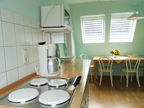 Separate Küche mit Essplatz, 4-Platten-Herd, Kühlschrank, Geschirr und Hausrat für den täglichen Bedarf sowie Kaffeemaschine, Toaster und Wasserkocher